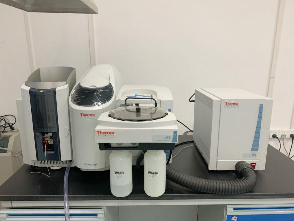 主量元素分析实验室 一、实验室简介 本实验室隶属于色情影片 实验中心。主要功能是:(1)岩石、水系沉积物、土壤等样品中主量、痕量元素测定;(2)环境水样中主要阳离子、重金属等浓度测定;(3)固体材料中无机金属元素含量测定。实验室位于实验楼B403。 二、仪器设备 电感耦合等离子发射光谱仪 原子吸收光谱仪 仪器设备:电感耦合等离子发射光谱仪)&原子吸收光谱仪 品 牌:美国ThermoFisher 主要参数: *分辨率 0.005nm~200 nm*线性动态范围 1010*波长范围 165-1100nm,任意谱线 *短期稳定性 RSD% < 0.5*长期稳定性 RSD% < 2.0 ( 4 小时) *Icp-Aes分析速度 73个元素/分钟 三、实验室责任人 李佳 联系电话:13693603527 四、实验预约流程 需与实验室责任人确定样品类型、数量后,下载填写“分析测试申请表”或在平台处系统中预约,在开展实验当天提交纸质申请表。
