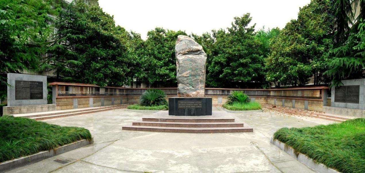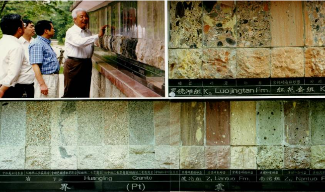 长江三峡以其气势之雄伟、山川之险峻、风景之秀丽闻名于世。三峡地区地层发育齐全、出露良好、化石丰富,岩石类型及沉积环境多种多样,因而三峡地层剖面在地学界闻名遐迩,素有“天然地质博物馆”之称。自上世纪初以来,三峡地区就已成为我国地质学家开展研究的重要场所,同时也是我校资源勘查工程、勘查技术与工程等专业沿用多年的地层学、沉积学实习基地。随着三峡大坝的建成,部分地质资源或有些地层的全部被淹没。为了抢救自然资源,从1996年开始,我校在石油天然气总公司和湖北省教委的支持下,经过几年努力,建成了长江三峡地层标本长廊教学基地(图12)。涂光炽、孙枢、王鸿祯、杨遵仪、李德生、付家谟、刘宝珺、赵鹏大、殷鸿福、田在艺、戴金星、翟光明、胡见义、李庆忠、邱中健、翁文波等16名中国科学院、中国工程院院士欣然命笔,为长江三峡地层标本长廊实习基地题词(图13)。