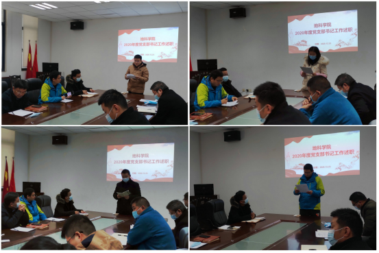 2020年度教工党支部工作述职会议。学院领导班子、党委委员、各系主任及党支部书记、工会主席、各科室长参与了本次会议。