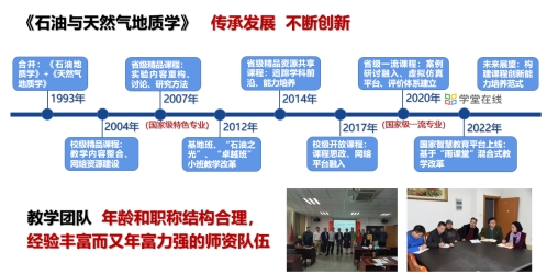 课程前身是《石油地质学》,1954年由著名石油地质学家、“陆相生油理论”主要创立者潘钟祥教授创建。1993年我校由原来的《石油地质学》和《天然气地质学》合并为《石油与天然气地质学》。历经几代人30余年的传承发展与持续创新,课程于2004年获批学校精品课程、2007年获批湖北省精品课程、2014年获批湖北省精品资源共享课、2020年获批湖北省首批一流本科课程,2022年建成在线开放课程上线学堂在线国家智慧教育平台。