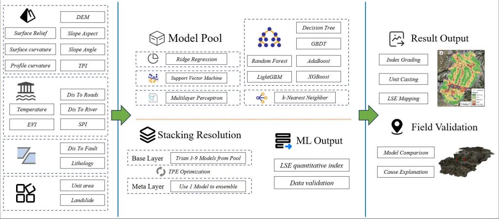 在模型构建过程中,本文特别强调了基学习器的选择对整体预测精度的重要性。为此,本文建立了一个由10种主流算法组成的模型池,涵盖了决策树、随机森林、梯度提升、支持向量机、神经网络等多类方法,并通过一定的参数优化算法进行优化。这样的组合不仅充分发挥了不同算法的优势,也为Stacking框架提供了坚实的基础支撑,大幅提升了模型在滑坡易发性预测中的准确性和稳定性(图2)。