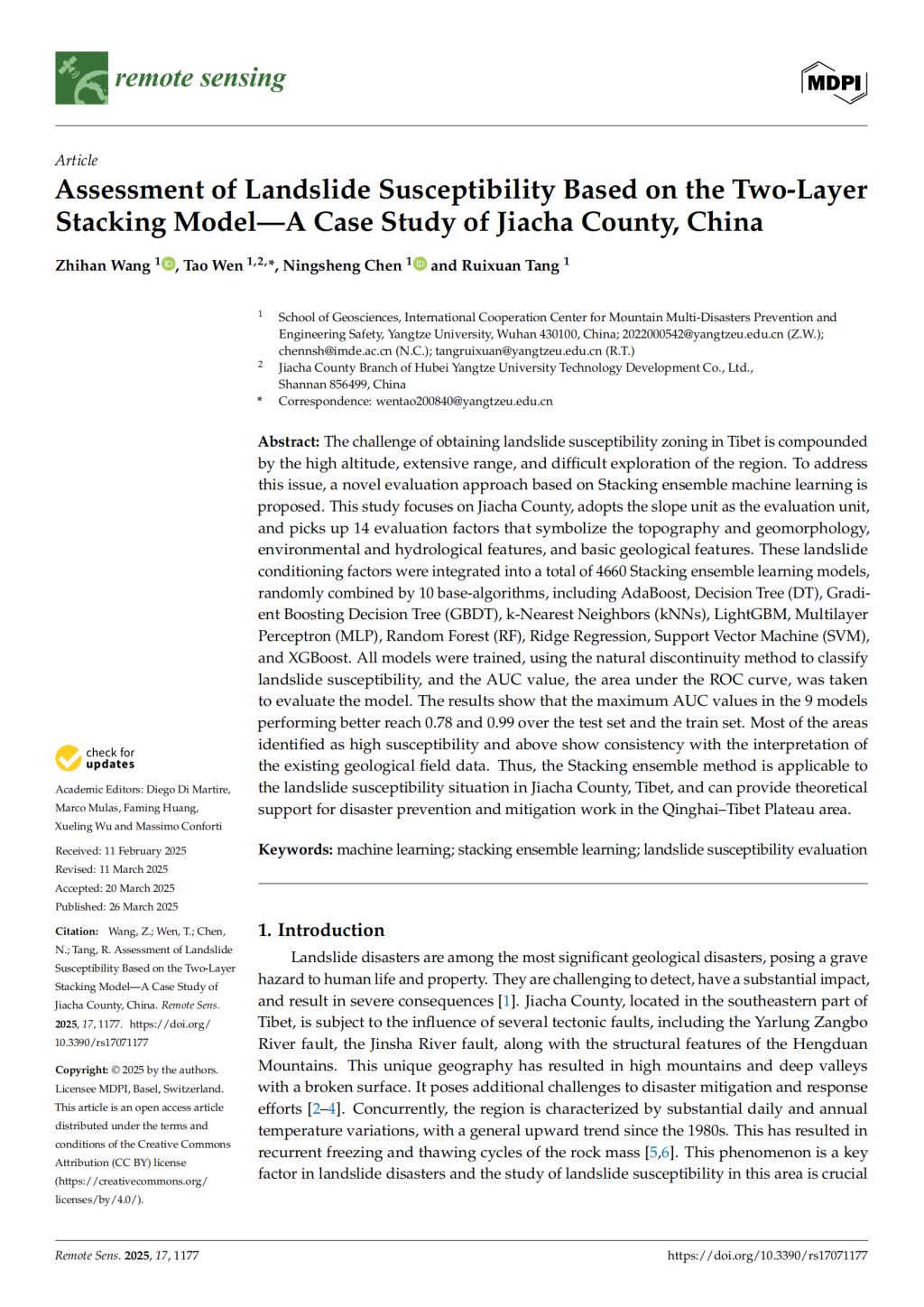 师生,本科生王芷含为论文第一作者,其导师温韬教授为通讯作者。论文借助两层Stacking集成学习模型对滑坡易发性进行评价,以西藏山南市加查县为研究区,取得了显著成果。