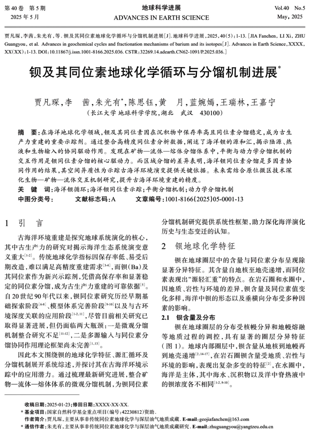 师生,本科生贾凡琛为论文第一作者,其导师朱光有教授为通讯作者。论文分析了钡(Ba)同位素在地球科学中的研究进展与面临的挑战,重点讨论了钡同位素的地球化学性质、储库与循环、分馏机理及古生力指示方面的应用。