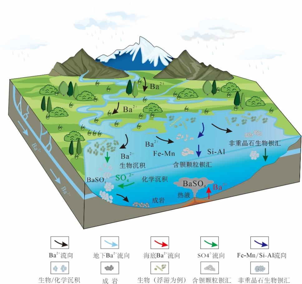 本文基于钡元素及其同位素的地球化学特征,系统阐述了钡在地球各圈层的储库分布与循环机制:海洋钡循环受陆源输入、热液活动及生物过程协同驱动—生物代谢释放形成动态“源”,陆源与热液物质沉降埋藏形成“汇”,源与汇的动态切换维持了钡循环的持续运转(图2)。研究进一步揭示,重晶石作为钡的主要汇聚形式,可分为沉积型和成岩型,其形成机理、通量及分布特征为示踪古环境提供了关键依据(图3)。