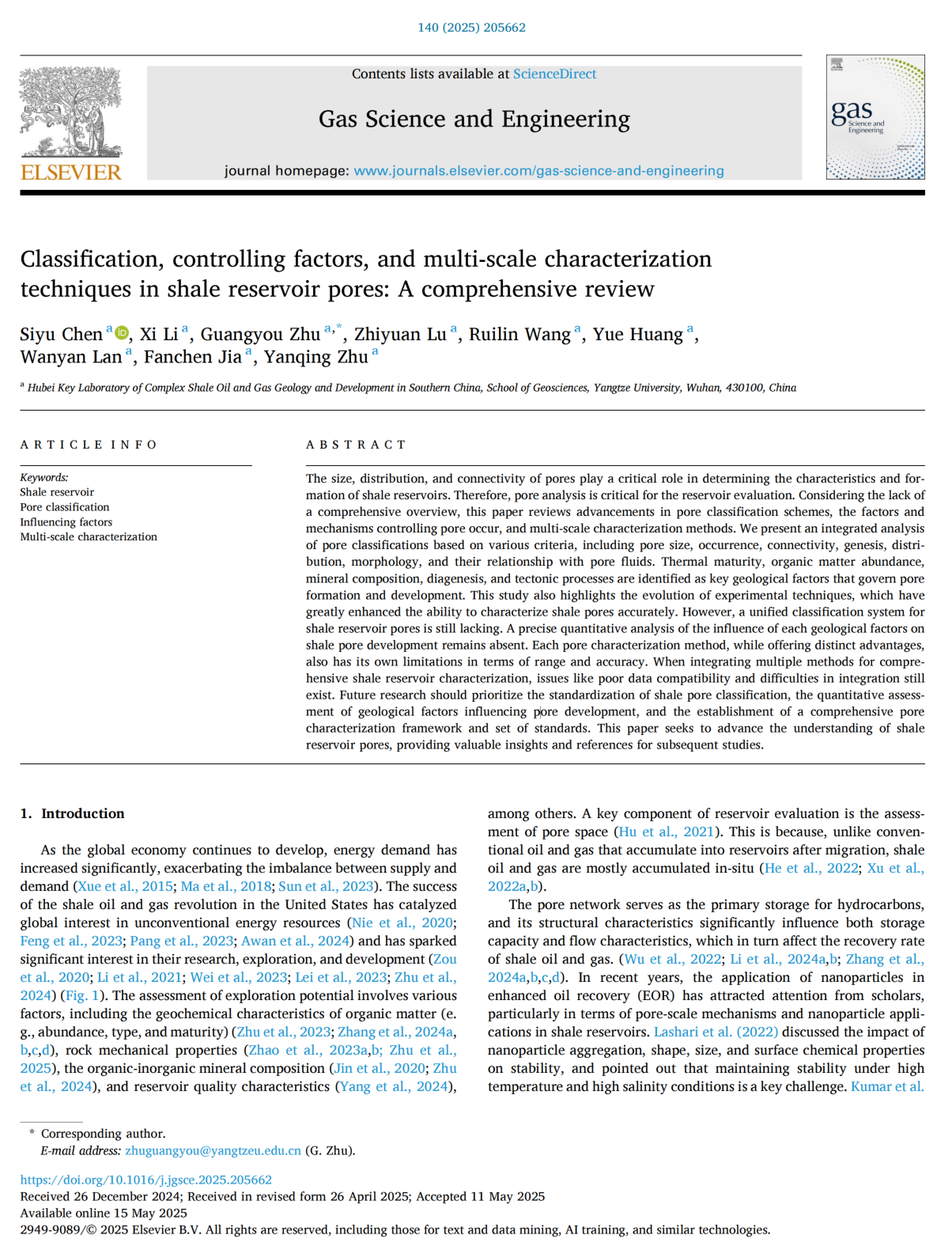 21级本科生(现在读大四)陈思钰在《Gas Science and Engineering》(GSE,原名Journal of Natural Gas Science and Engineering,天然气科学与工程,最新影响因子为5.285,位列JCR分区一区,中科院期刊分区工程技术大类二区)上发表了题为《Classification, Controlling Factors, and Multi-Scale Characterization Techniques in Shale Reservoir Pores: A Comprehensive Review》的论文(共18页)。全部作者均来自色情影片