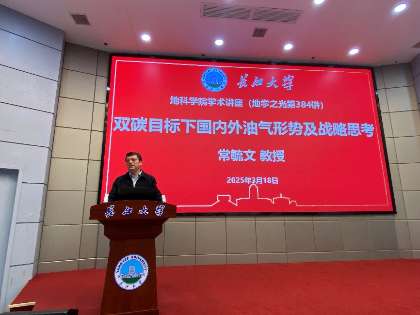 ,做客“地学之光”第384讲学术论坛,为我校师生作题为《双碳目标下国内外油气形势及战略思考》的学术报告,报告由校党委副书记敖廷华主持。