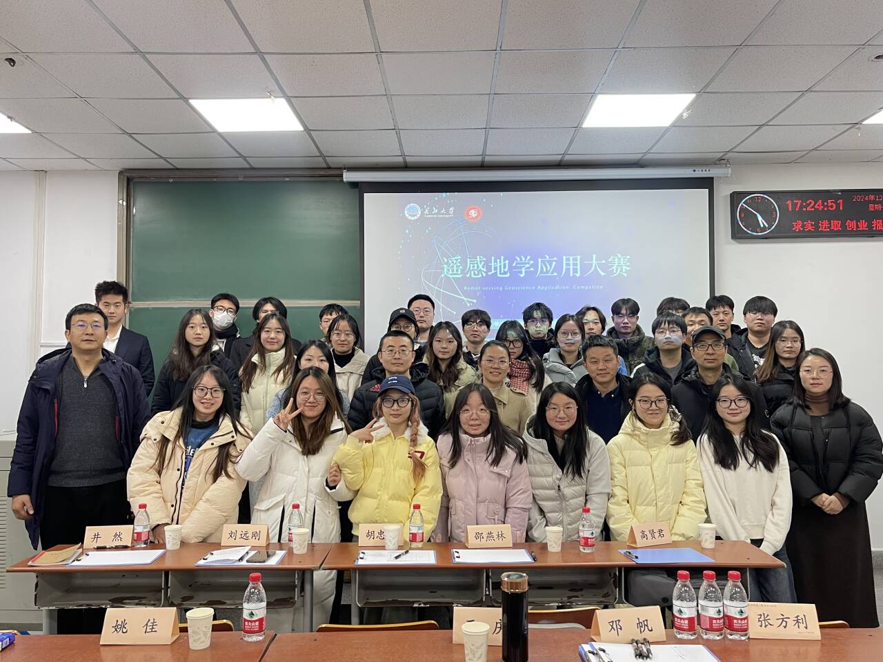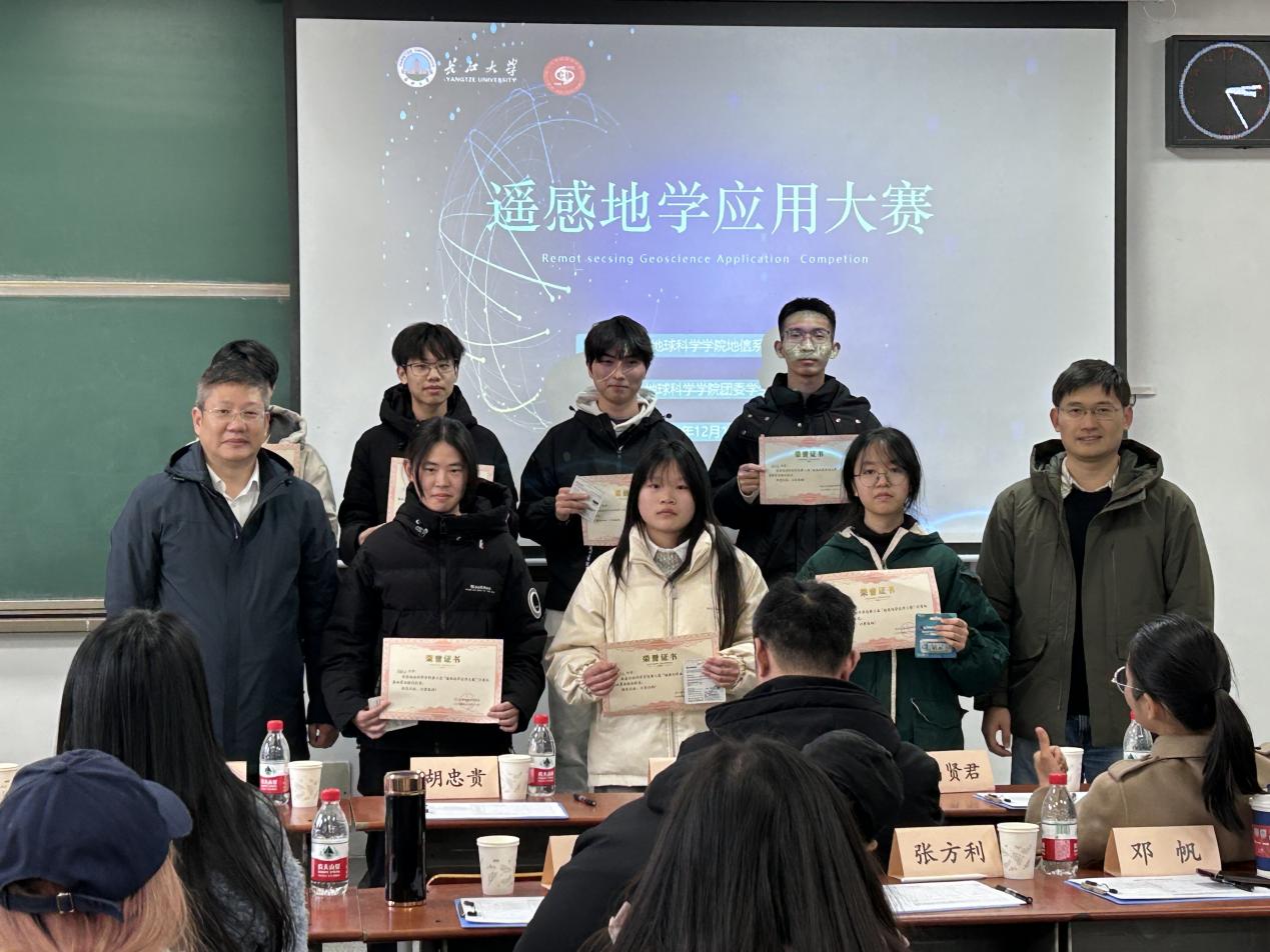 最终,“计算机基础算法组”11人获优胜奖,“遥感应用分析组”孙浩宇组获得一等奖,邱振翔组、饶旭乾组和石赵雄组获“二等奖”,刘海川组、丁百娇组、张家然组、李龙凡组获“三等奖”。评委老师依次为获奖选手颁奖,并合影留念