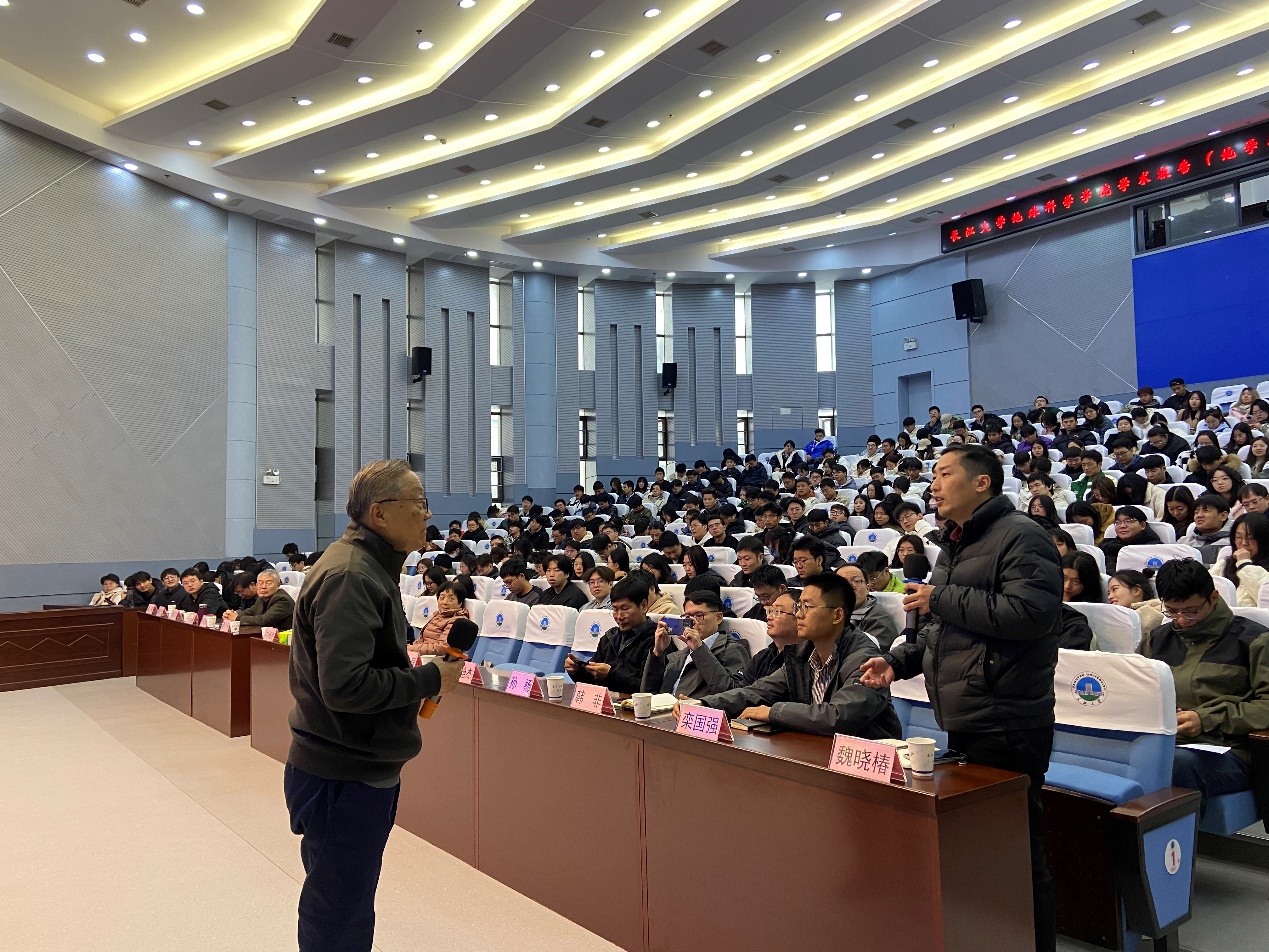 在随后的交流环节中,周新华研究员与在场师生进行了热情互动。面对关于研究生方向选择、科研能力提升、科研效率保持及工作与家庭平衡等问题,周新华研究员鼓励大家,既然历史的幸运光顾了这一代人,我们就应当肩负起时代的责任,自立自强,自信自律,勉力前行,为中华民族在全球发展中作出更大贡献。
