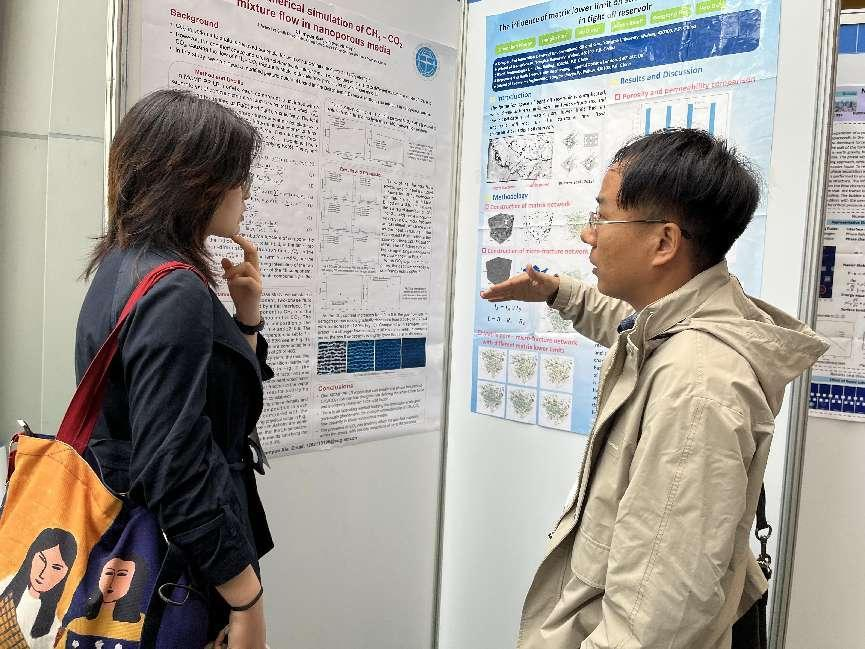 此次会议主题为“多孔介质与生物学”,共设置24个分会场,超过400余位学者作学术报告,展示230多个学术海报,共同探讨多孔介质领域的最新进展,涵盖了多孔介质在能源、环境、生物、农业、材料科学等领域的理论、应用及前沿技术。在为期四天的会议中,我校代表团成员积极参与了各种学术活动。其中,博士生闫康和朱朝彬就其在多孔介质研究领域的最新成果进行了题为“Seepage Model of Conglomerate Based on Deep Neural Network and Finite Element-Discrete Element Coupling”和“Differential Mechanisms of Acidic Fluid-induced Dissolution in Ahe Formation Reservoirs across Various Locations within the Northern Structural Zone of theKuqaDepression”的口头报告,并与现场学者进行了深入交流。其他参会代表也通过会后讨论、海报交流等方式展示他们的研究成果,并与来自世界各地的专家学者进行了深入的学术交流。