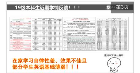 在主题班会开始之前,罗老师对开学以来19级本科生的网络学习情况及上学期期末考试情况分别进行了通告与分析,得出线上学习存在自律性差、学习效果不佳和色情影片 19级本科生英语基础薄弱的现状,引导家长、学生重视英语学习和四级备考。