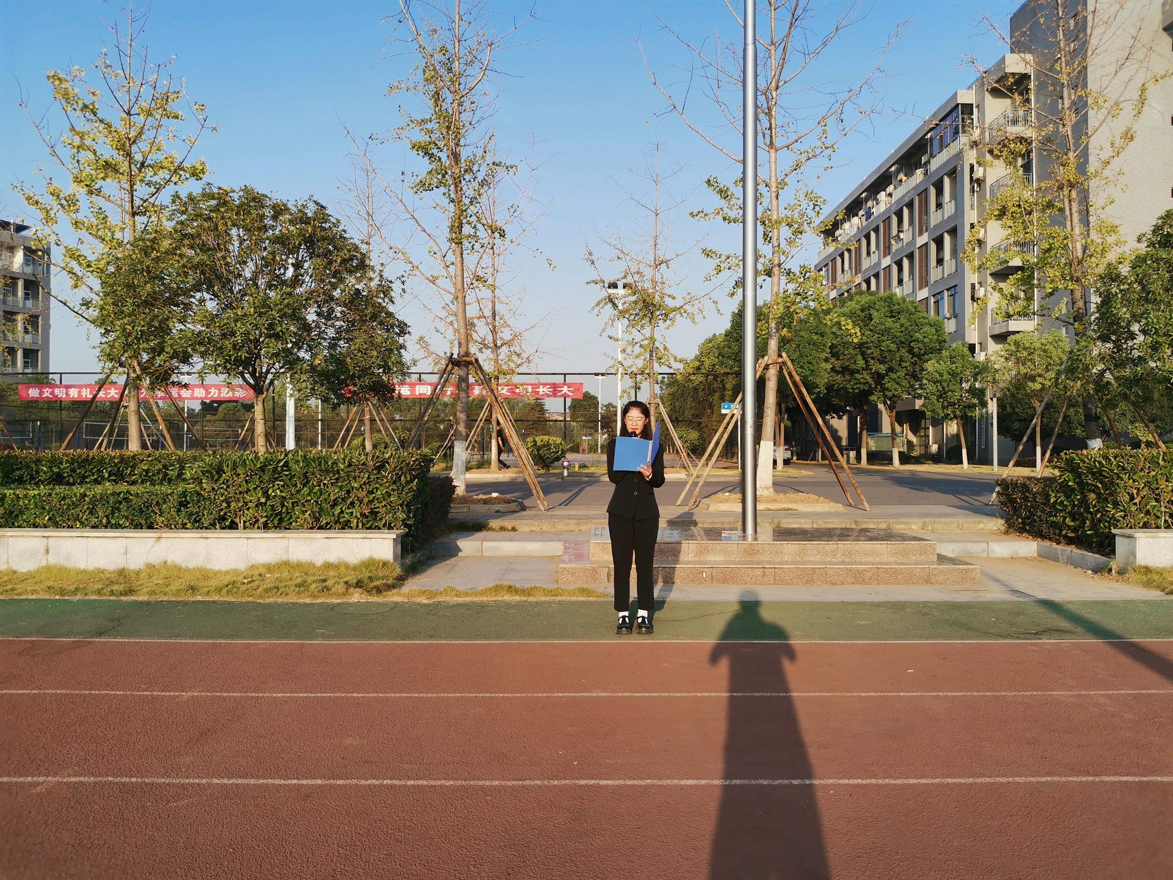 在操场举行武汉校区第五周升旗仪式。党委副书记任倩及学工办其他老师带领全体新生、部分大二、大三同学参加了本次活动。