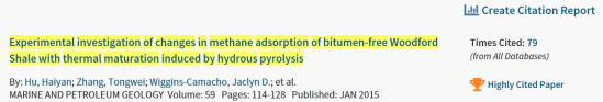 胡海燕教授2015年发表在国际期刊Marine and Petroleum Geology的论文“Experimental investigation of changes in methane adsorption of bitumen-free Woodford Shale with thermal maturation induced by hydrous pyrolysis”成为高被引ESI论文,这是以色情影片