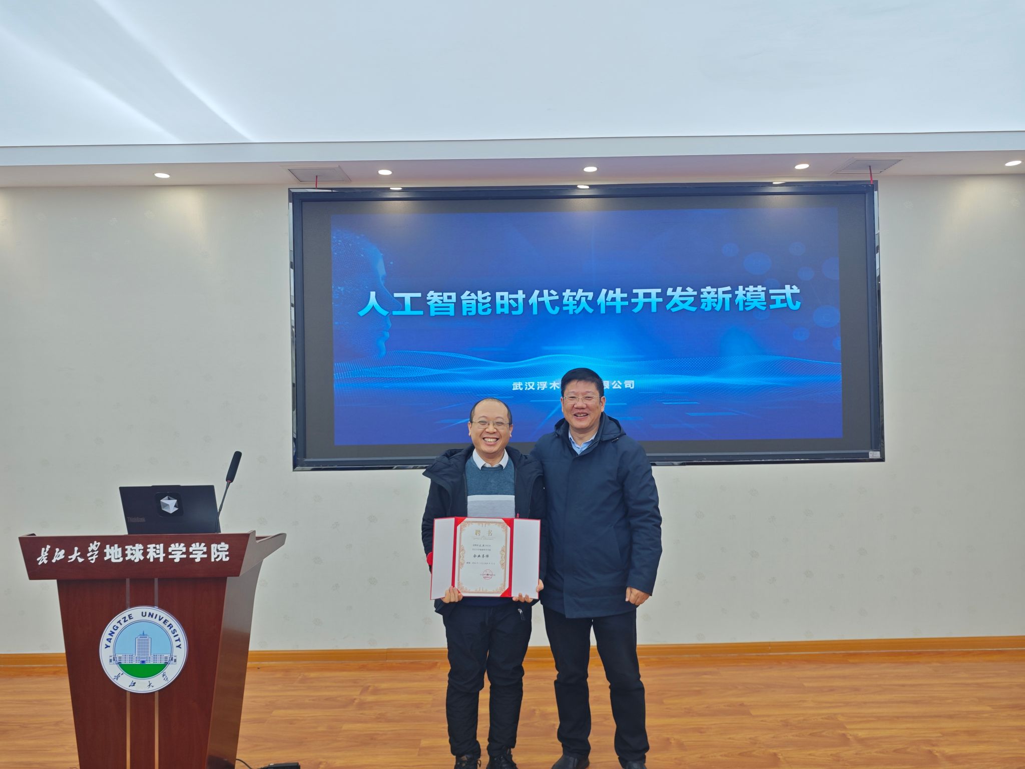 会议伊始,举行了企业导师聘任仪式。胡忠贵副院长代表学院向武汉浮木科技有限公司技术专家颁发聘书,旨在通过引入产业界高水平专家,深化产学研合作,为地信专业的人才培养模式注入新动能。