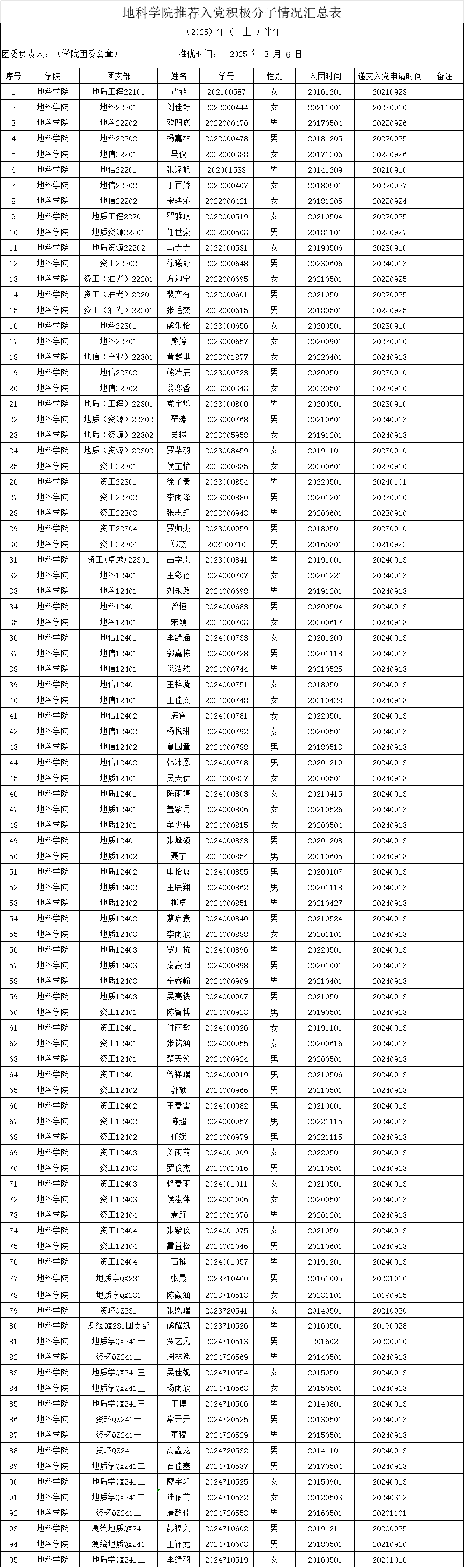 推荐入党积极分子情况汇总表