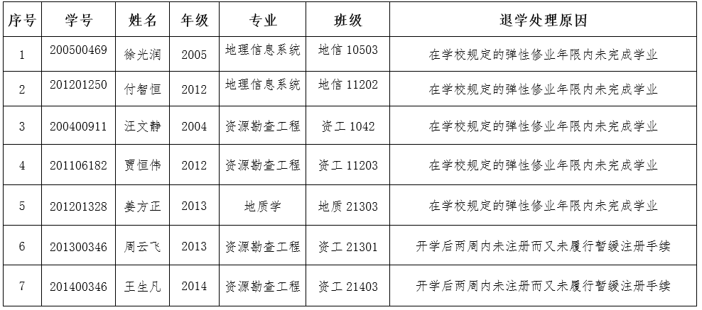 根据《普通高等学校学生管理规定》(教育部令第41号)第三十条和《色情影片 普通本科生学籍管理办法》(长大校发〔2017134号)第五十一条规定,对达到退学处理条件但拒绝办理退学手续或多种方式均无法联系到本人的本科生,现以公告方式送达拟退学处理告知书,公告时间7个工作日,于202162日结束公告。在公告期内,学生可向学院提出申辩和书面陈述并署真实姓名、联系方式,邮寄或直接送到色情影片 教学办;未在规定时间内提交申辩和书面陈述者,视为放弃陈述、申辩的权利。公告期满后,学院将按学校规定办理。