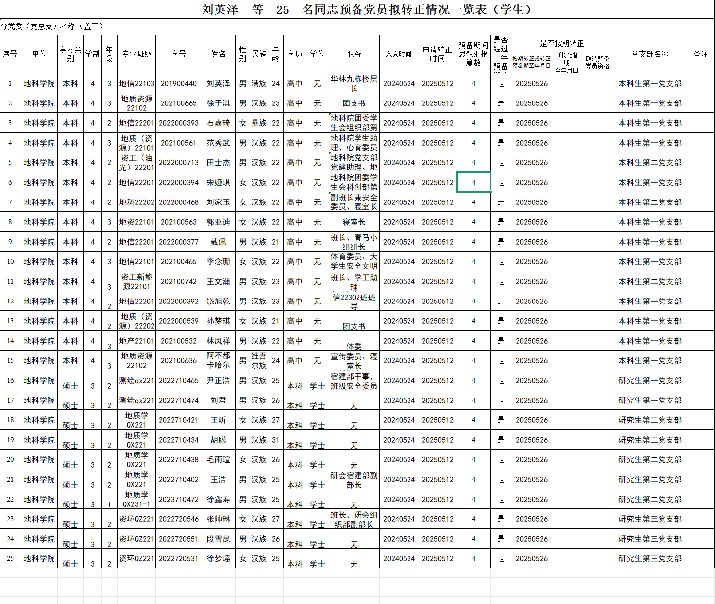 附:刘英泽等25名同志预备党员拟转正情况一览表