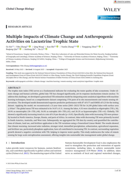 论文信息:Xie, G., Y. Zhang, Q. Wang, et al. 2025. “ Multiple Impacts of Climate Change and Anthropogenic Activities on Lacustrine Trophic State.” Global Change Biology 31, no. 9: e70510. //doi.org/10.1111/gcb.70510.