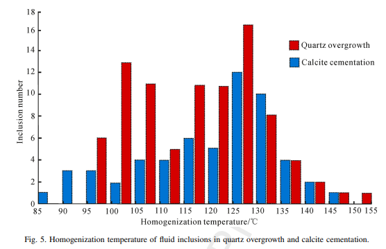 图3.石英与方解石胶结物中流体包裹体的均一温度