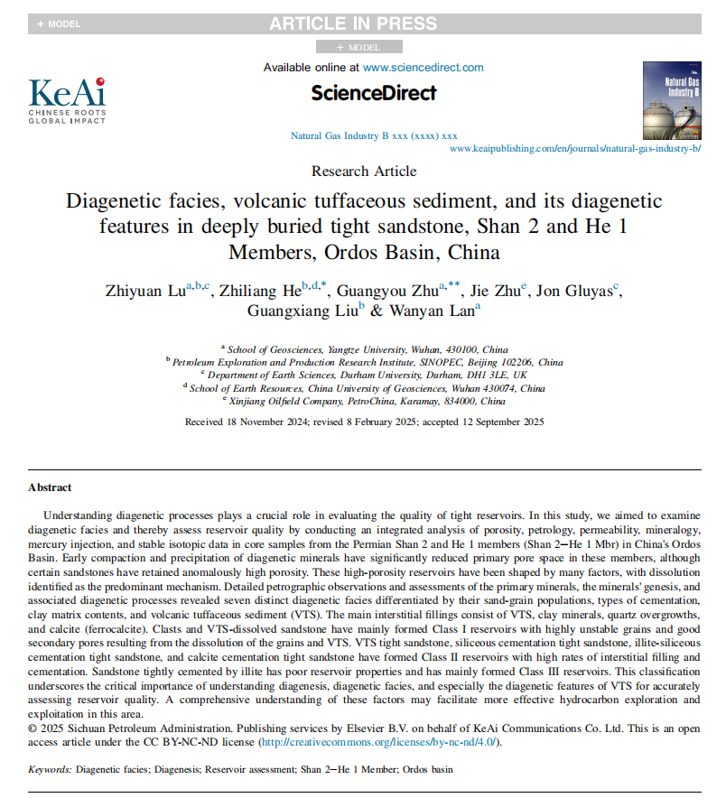 深层与非常规团队、中国石化石油勘探开发研究院及杜伦大学等机构的联合研究团队,围绕山2-盒1段致密砂岩的成岩相类型、火山凝灰质沉积(VTS)及其成岩特征展开系统研究,在Natural Gas Industry B(主编:邹才能院士,张金川教授,中科院工程技术大类2区、能源与燃料小类2区)发表Diagenetic Facies, Volcanic Tuffaceous Sediment, and Its Diagenetic Features in Deeply Buried Tight Sandstone, Shan 2 and He 1 Members, Ordos Basin, China(鄂尔多斯盆地山2段-盒1段深埋致密砂岩成岩相、火山凝灰质沉积物及其成岩特征),旨在揭示其对储层物性的控制机制,为该区致密气高效勘探与开发提供理论依据。
