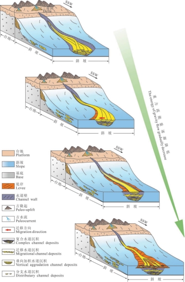提出了“复合水道→迁移水道→垂向加积水道→分支水道”的演化序列,揭示了重力流流体从碎屑流到高密度浊流再到低密度浊流、能量从高到低、沉积方式从侵蚀充填到加积分散的动态过程,建立了重力流水道完整的演化模式(图2)。