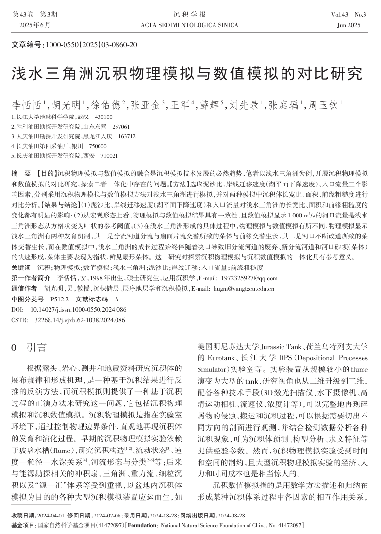 2020级研究生李恬恬在核心期刊《沉积学报》上发表了题为《浅水三角洲沉积物理模拟与数值模拟的对比研究》的论文(共20页)。研究生李恬恬为论文第一作者,其导师胡光明教授为通信作者。论文重点讨论了浅水三角洲发育的控制因素、沉积演化规律、形态展布特征等,比较物理模拟和数值模拟结果的相似性。