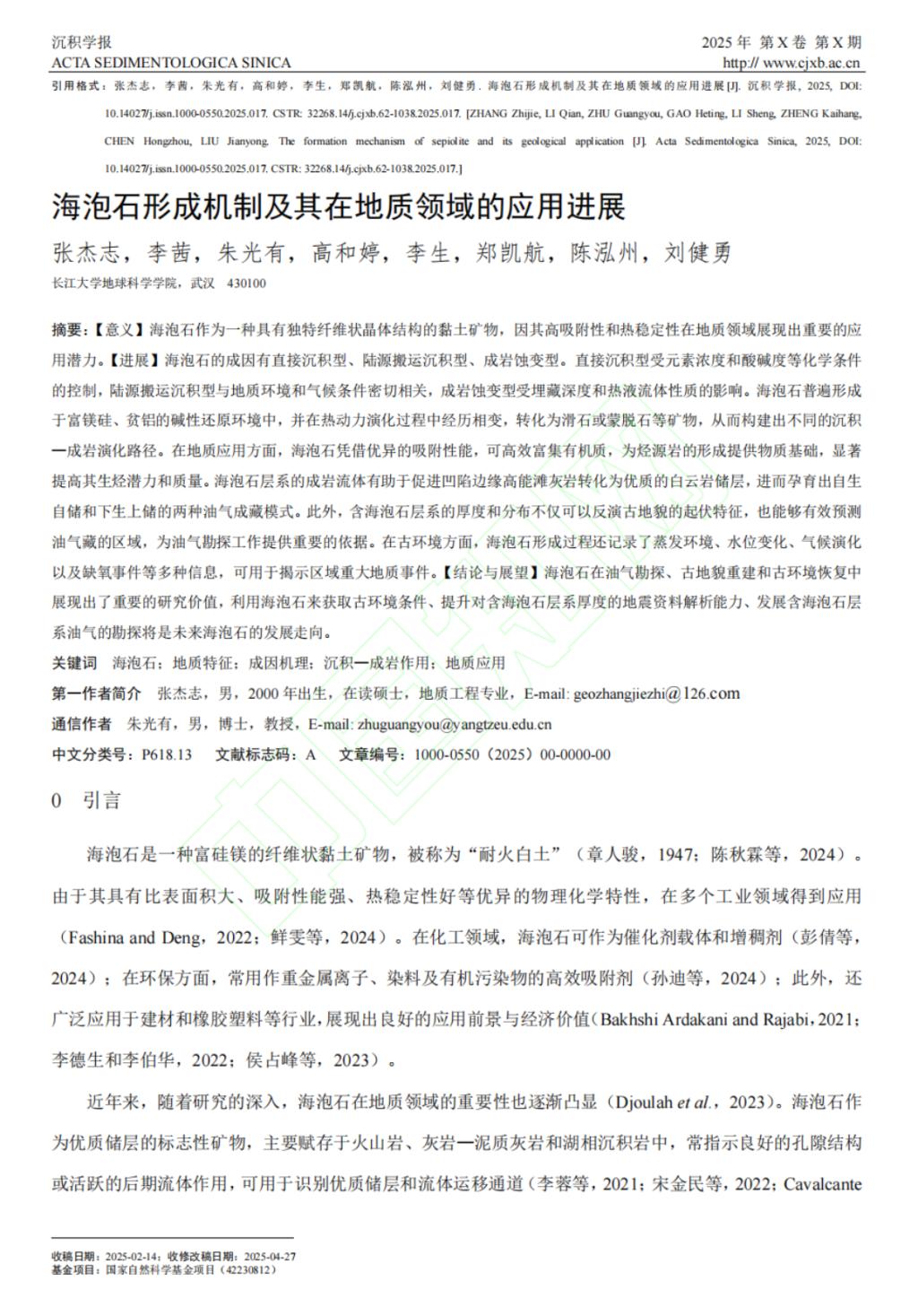 师生,研究生张杰志为论文第一作者,其导师朱光有教授为通信作者。论文重点讨论了海泡石的地质特征、成因机制、沉积—成岩的关系以及在地质领域的应用。