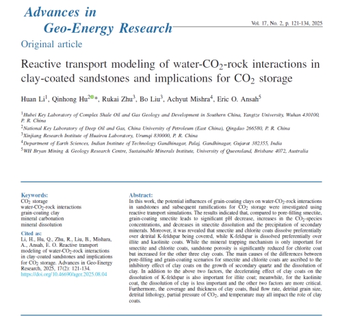 论文信息:Li, H.,Hu, Q.,Zhu, R.,Liu, B.,Mishra, A.,Ansah, E.O., 2025. Reactive transport modeling of water-CO2-rock interactions in clay-coated sandstones and implications for CO2storage.Advances in Geo-Energy Research,17(2): 121-134.//doi.org/10.46690/ager.2025.08.04.