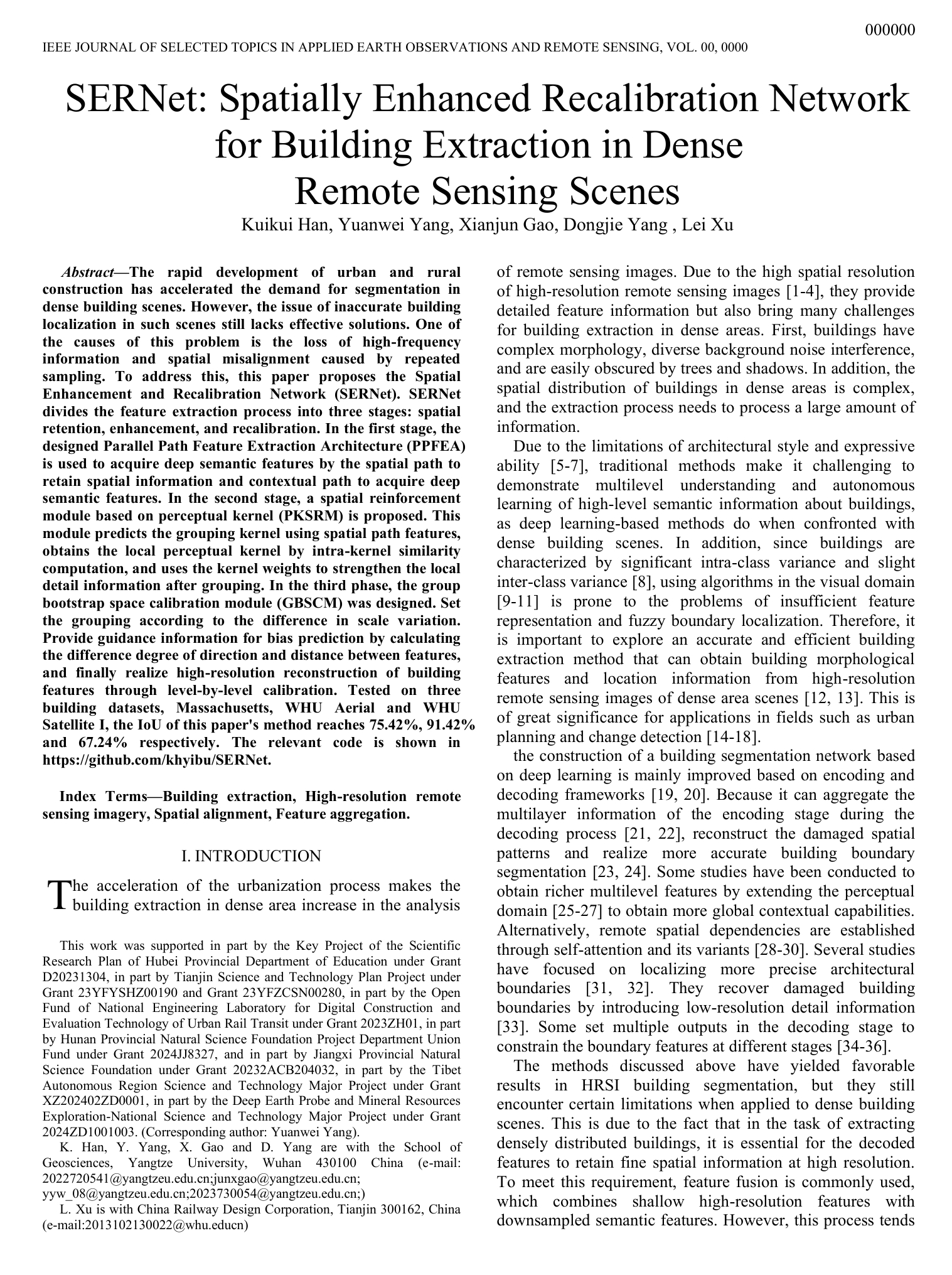 研究生韩奎奎以第一作者身份在SCI二区期刊《IEEE Journal of Selected Topics in Applied Earth Observations and Remote Sensing》上发表题为“SERNet: Spatially Enhanced Recalibration Network for Building Extraction in Dense Remote Sensing Scenes”的研究论文,其中色情影片