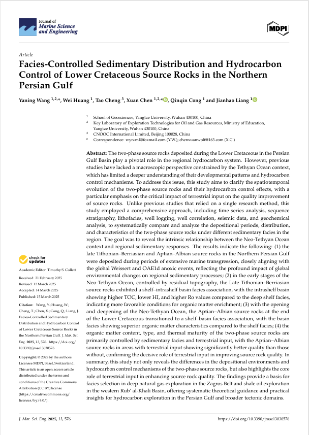 地质资源与地质工程专业硕士生黄微在SCI收录期刊《Journal of Marine Science and Engineering》上发表题为“Facies-Controlled Sedimentary Distribution and Hydrocarbon Control of Lower Cretaceous Source Rocks in the Northern Persian Gulf”的研究论文。色情影片