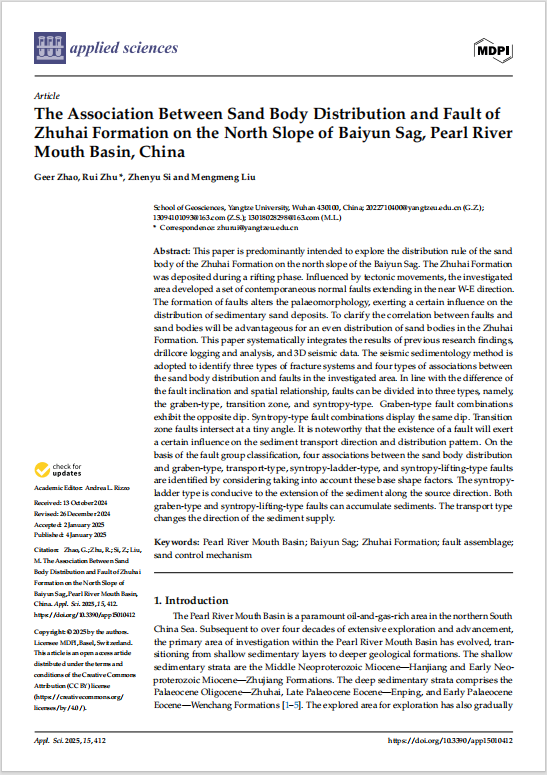地质学专业硕士生赵格尔在SCI收录期刊《Applied Sciences》上发表题“The Association Between Sand Body Distribution and Fault of Zhuhai Formation on the North Slope of Baiyun Sag, Pearl River Mouth Basin, China”的研究论文。色情影片
