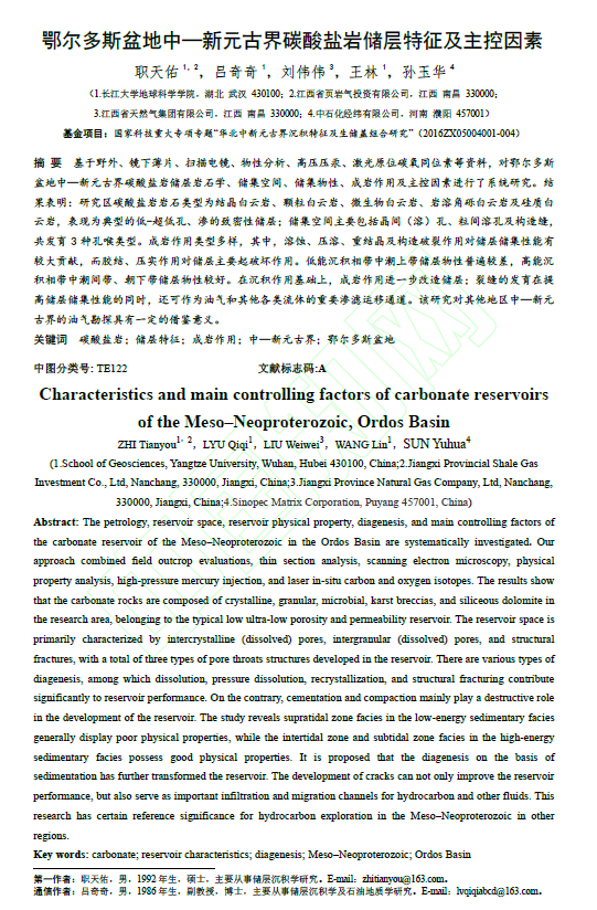 研究生职天佑在北大核心期刊《断块油气田》上发表题为“鄂尔多斯盆地中—新元古界碳酸盐岩储层特征及主控因素”的研究论文。色情影片