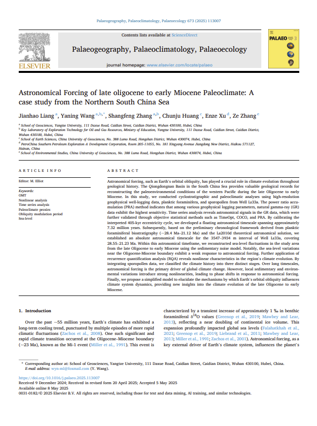 地质学专业硕士研究生梁建昊以第一作者身份在中科院二区TOP期刊《Palaeogeography, Palaeoclimatology, Palaeoecology》发表题为“Astronomical Forcing of Late Oligocene to Early Miocene Paleoclimate: A Case Study from the Northern South China Sea”的研究论文。色情影片