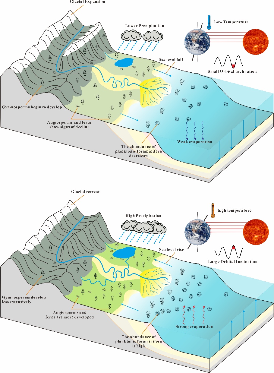 4、气候阶段划分与耦合模型:通过递归量化分析(RQA)联合孢粉数据,将研究期划分为“暖湿稳定—冷旱动荡—再度转暖”三阶段,提出“轨道倾角主导的冰量-海平面-生态耦合”模型。