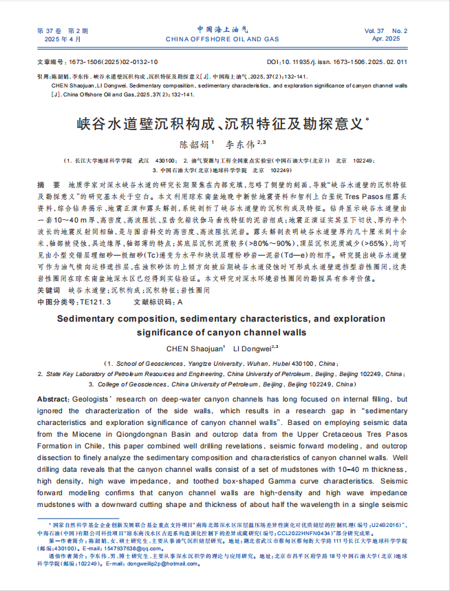论文利用琼东南盆地晚中新世地震资料和智利上白垩统 Tres Pasos组露头