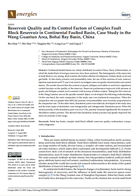 硕士生韩微在《Energies》发表题为“Reservoir Quality and Its Control Factors of Complex Fault Block Reservoir in Continental Faulted Basin, Case Study in the Wang Guantun Area, Bohai Bay Basin, China”的研究论文。文章主要研究中国东部广泛分布着陆相断陷盆地中碎屑岩储层的储层质量及控制因素。断层对油气藏具有封堵作用,断块内储层非均质性极强,严重制约了此类油气田的高效开发。本研究通过孔隙度与渗透率测试、岩石薄片鉴定、压汞实验及CT扫描等技术手段,系统分析了储层质量特征及其控制因素。结果表明:岩石中石英、长石与岩屑含量对储层质量具有显著控制作用——石英与长石含量增加时储层物性改善,岩屑含量增加时储层物性恶化。以王官屯地区EKI储层为具体研究对象,得出以下认识:一方面,研究区压实作用以机械压实为主,当压实率超过60%时,孔隙度与渗透率随压实率增大而降低;另一方面,研究区溶蚀孔隙较发育,主要发育粒内溶孔与粒间溶孔两类,当溶蚀面孔率超过9.2%时,孔隙度随溶蚀面孔率增大显著提升,表明该区间溶蚀作用对储层孔隙改善效果显著。