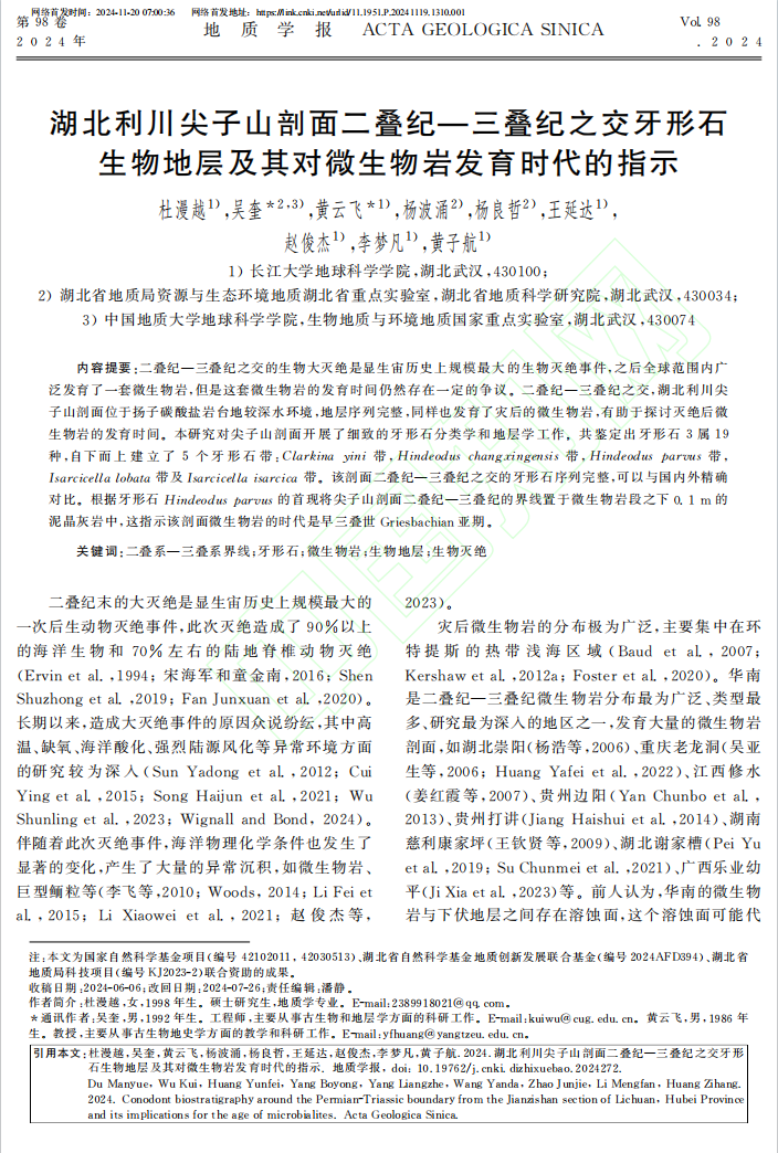 黄云飞教授团队长期从事古-中生代之交重大地质转折期生物灭绝与生物复苏方面的研究,团队成员杜漫越在地质学报EI期刊上发表题为“湖北利川尖子山剖面二叠纪—三叠纪之交牙形石生物地层及其对微生物岩发育时代的指示”的研究论文。色情影片