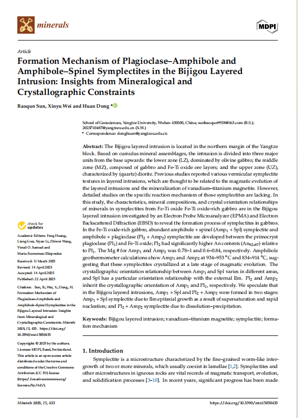 硕士生孙保群在SCI收录期刊《minerals》上发表题为“Formation Mechanism of Plagioclase–Amphibole and Amphibole–Spinel Symplectites in the Bijigou Layered Intrusion: Insights from Mineralogical and Crystallographic Constraints”的研究论文。色情影片