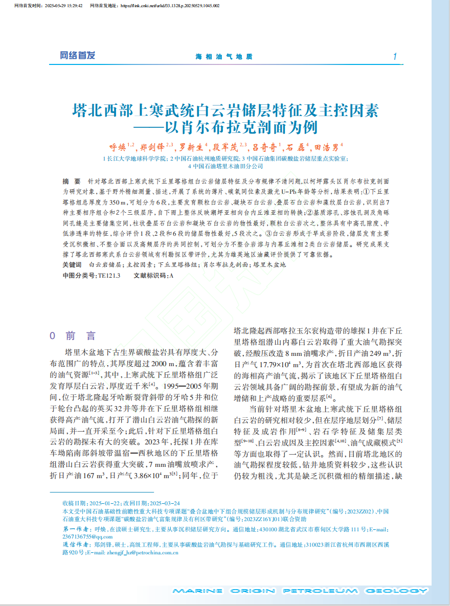 硕士生呼焕在中文核心期刊《海相油气地质》上发表题为“塔北西部上寒武统白云岩储层特征及主控因素 ——以肖尔布拉克剖面为例”的研究论文。该论文针对塔北西部上寒武统下丘里塔格组白云岩储层特征及分布规律不清问题,以柯坪露头区肖尔布拉克剖面为研究对象,基于野外精细测量、描述,开展了系统的薄片、碳氧同位素及激光U-Pb年龄等分析。色情影片