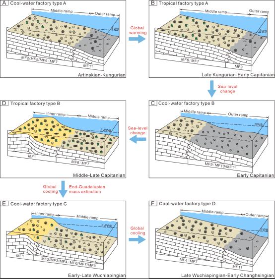 碳酸盐工厂概念的提出是为了解释碳酸盐生产的空间与过程,这一进程受气候变化的影响较为显著。二叠纪时期发生了几次重大的气候变化事件,对碳酸盐工厂生产产生了相当大的影响。但二叠纪碳酸盐工厂对这些气候事件的响应仍不太清晰。因此本文选取鄂西沿渡河剖面进行碳酸盐岩微相分析,探讨碳酸盐工厂与气候变化之间的关系。研究发现,鄂西沿渡河剖面二叠系地层可识别出10种沉积微相类型,并将其分为3个微相组合,分别对应内缓坡、中缓坡以及外缓坡沉积环境。同时识别出8个海侵-海退体系域,揭示了与华南其他地区相同的海平面变化趋势。此外,依据不同层位生物组合差异,共划分出6种碳酸盐工厂,并识别出5次碳酸盐工厂转变。其中,发生在空谷阶晚期以及吴家坪阶早期的转变可能与气候变化有关,而发生瓜德鲁普世末期的转变可能受生物灭绝事件与气候变化共同影响。其余两次转变则与海平面波动有关。因此,气候变化可能通过影响表层海水温度以及海平面升降,从而控制产生碳酸盐的生物群落,进而导致碳酸盐工厂类型转变。