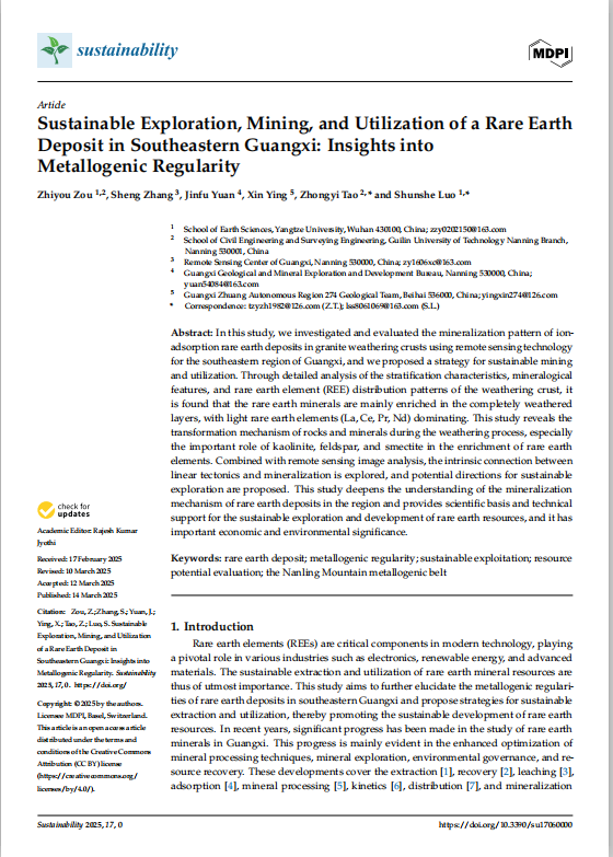 我校色情影片 博士生邹志友相关研究成果以“Sustainable Exploration, Mining, and Utilization of a Rare Earth Deposit in Southeastern Guangxi: Insights into Metallogenic Regularity”为题,发表于《SUSTAINABILITY》期刊。该研究针对广西东南部稀土矿床,系统揭示了离子吸附型稀土矿的成矿规律,并对该矿区提出了可持续开发策略,为稀土资源的高效利用与生态保护提供了参考。