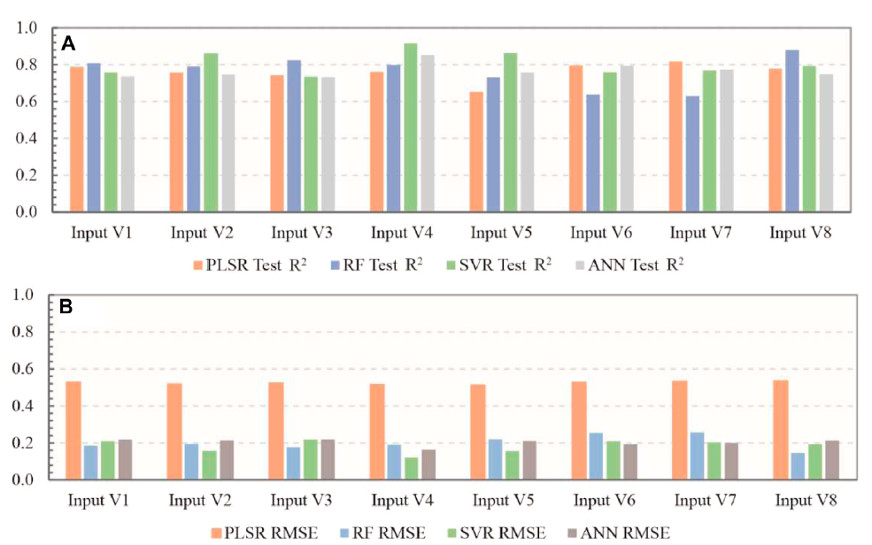 图2 白云石含量预测精度评价 (A)评价指标R2对比(B)评价指标RMSE对比