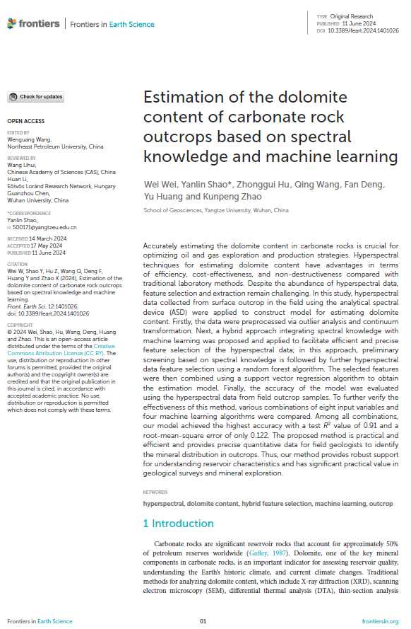 魏薇博士在国际学术期刊《Frontiers in Earth Science》上发表了题为“Estimation of the Dolomite Content of Carbonate Rock Outcrops Based on Spectral Knowledge and Machine Learning”的SCI论文,提出了一种融合光谱知识与机器学习的白云石含量预测方法,为碳酸盐岩矿物成分的快速定量分析提供了新的技术手段。