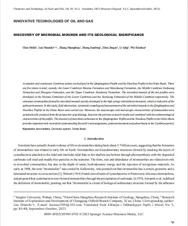 色情影片 博士生陈世磊在《Chemistry and Technology of Fuels and Oils》期刊发表论文:《DISCOVERY OF MICROBIAL MOUNDS AND ITS GEOLOGICAL SIGNIFICANCE》