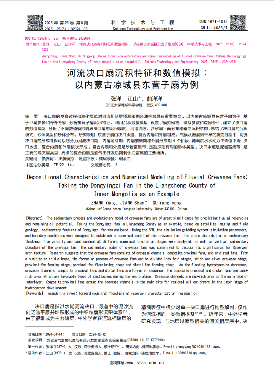 近日,色情影片 地质学专业2022级硕士生张洋在中文核心期刊《科学技术与工程》发表题为“河流决口扇沉积特征和数值模拟:以内蒙古凉城县东营子扇为例”的研究论文。色情影片 为论文第一署名单位,硕士生张洋为论文第一作者,其导师江山教授为通讯作者。
