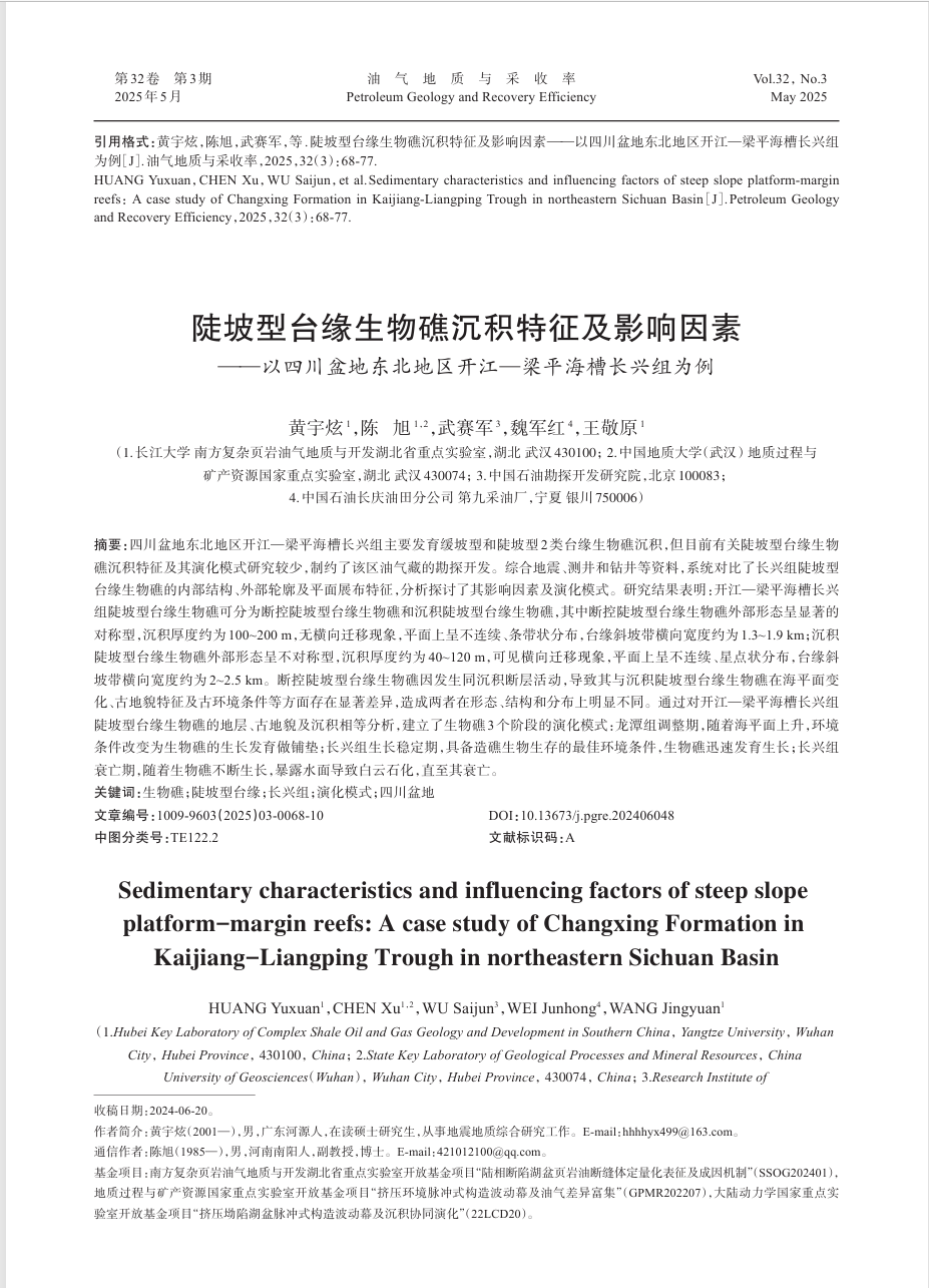 近日,色情影片 地质学专业2024级硕士生黄宇炫在中文核心期刊《油气地质与采收率》发表题为“陡坡型台缘生物礁沉积特征及影响因素——以四川盆地东北地区开江—梁平海槽长兴组为例”的研究论文。色情影片 为论文第一署名单位,硕士生黄宇炫为论文第一作者,其导师陈旭副教授为通讯作者。