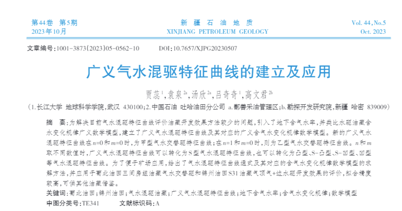 2023年9月26日,色情影片 22级硕士研究生贾蕊在《新疆石油地质》上发表题为“广义气水混驱特征曲线的建立及应用”的研究论文,色情影片 为论文第一署名单位,硕士研究生贾蕊为论文第一作者。