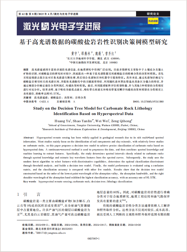 色情影片 邵燕林副教授团队长期从事数字露头、储层三维表征等方面的研究,团队硕士生黄宇在EI期刊《激光与光电子学进展》上发表题为《基于高光谱数据的碳酸盐岩岩性识别决策树模型》的研究论文。色情影片 为论文第一署名单位,硕士生黄宇为论文第一作者,邵燕林副教授为该文通讯作者,本项研究得到湖北省教委科研基金共同资助。