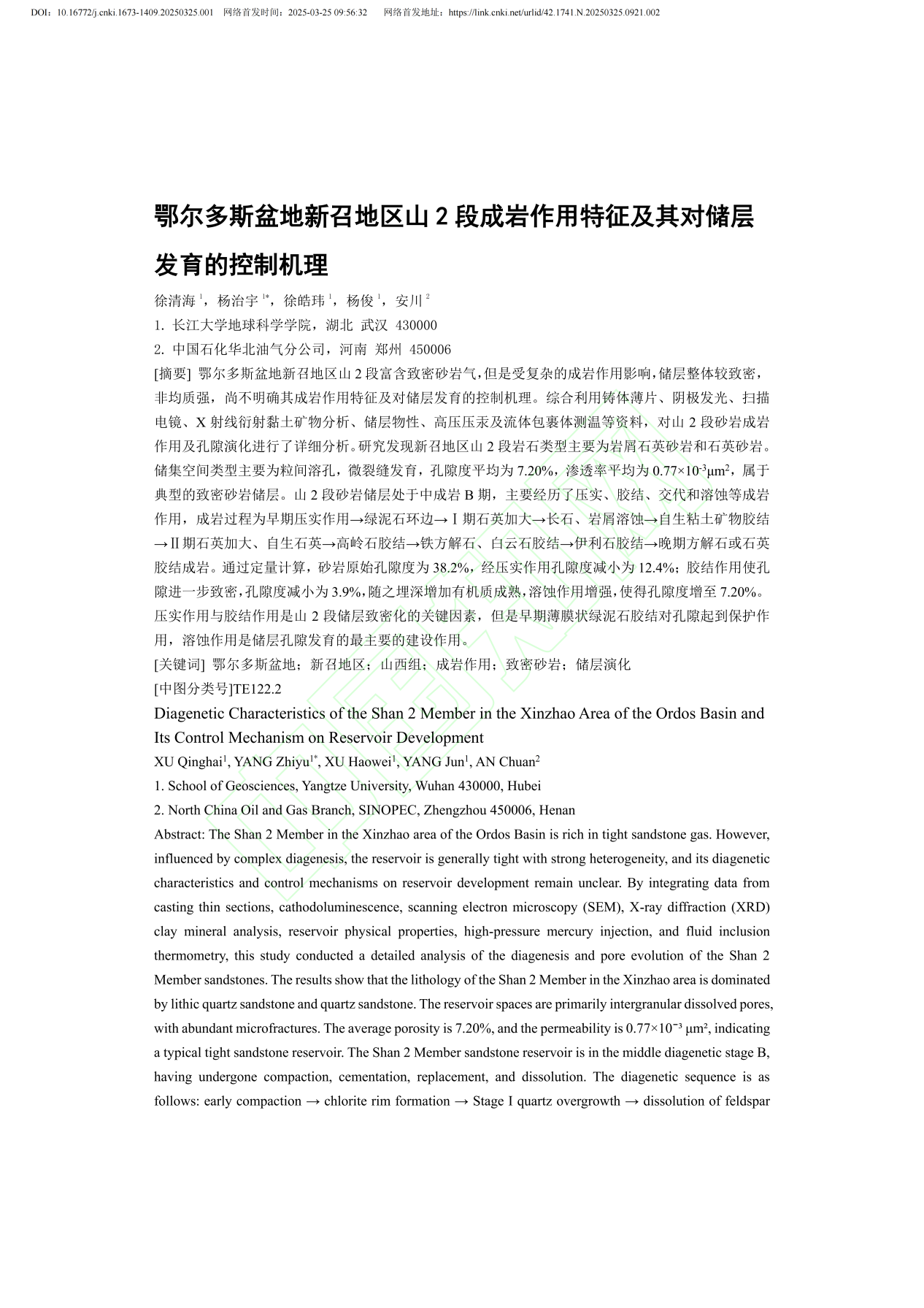 学报》上发表题为“鄂尔多斯盆地新召地区山2段成岩作用特征及其对储层发育的控制机理”的研究论文,色情影片