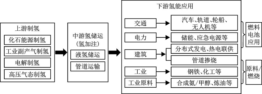氢能是未来新型能源体系的关键储能介质,是推动化工领域脱碳的重要原料,已被世界各国列入本国能源化工行业发展规划。详细介绍了氢能的基本性质、全产业链基本概况,概述了当前氢能在国内外的应用发展现状,着重综述了氢能在化工合成、石油化工及煤化工中的开发利用进展。由于受核心材料研发成熟度低、技术标准建设不足、基础设施配套薄弱等方面的影响,氢能在化工领域中的应用仅初具规模。建议未来应致力于加强氢能应用理论与技术方面研究、建立健全顶层规划、政策与标准体系、加大对氢能基础设施建设的投入力度,共同推进我国氢能在化工领域的快速发展。