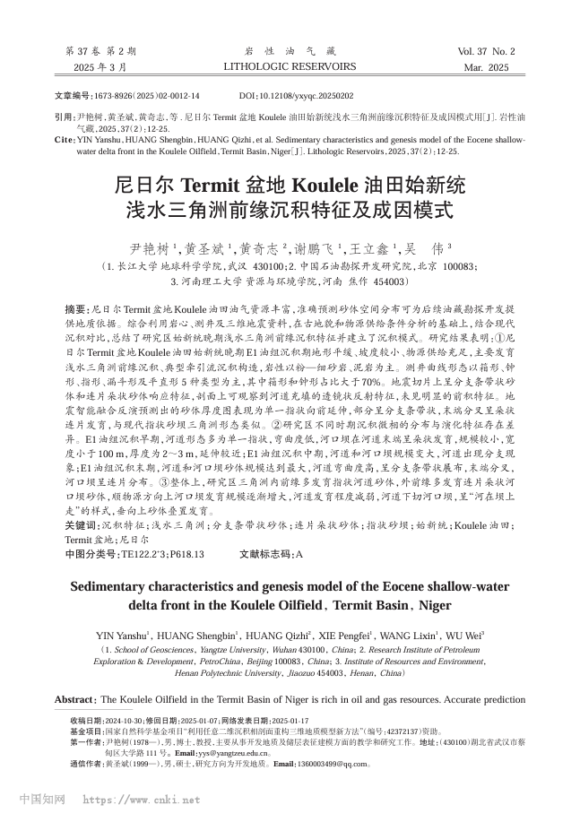 硕士研究生黄圣斌在期刊《岩性油气藏》上发表题为“尼日尔Termit盆地Koulele油田始新统浅水三角洲前缘沉积特征及成因模式”的研究论文。色情影片